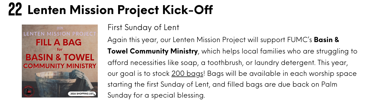 At the same time, Lent calls us to more than remembering. It invites us to grow: to go deeper in faith, reach further in love, and step more fully into discipleship.